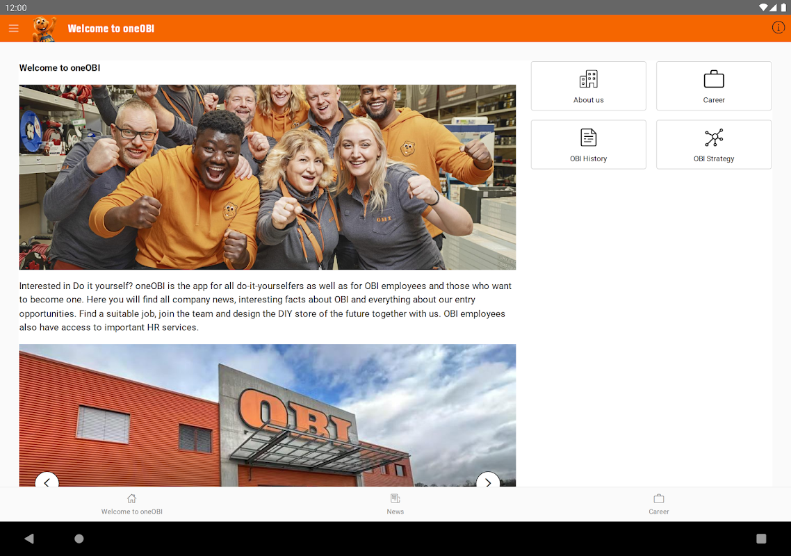Interested in do it yourself? oneOBI is the app for all DIY enthusiasts as well as for OBI employees and those who want to become one. Here you will find all company news, press releases, facts and figures about OBI and everything about our entry opportunities. Find a suitable position, join the team and shape the DIY store of the future together with us. Authorized users also have access to important HR services.