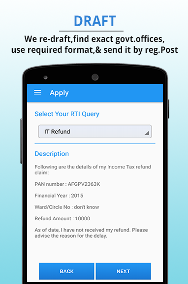 OnlineRTI.com is an online service to file your RTI application. We have a unified interface to file RTI application to all center and state departments. With this app you can file RTI application directly from your Android devices.