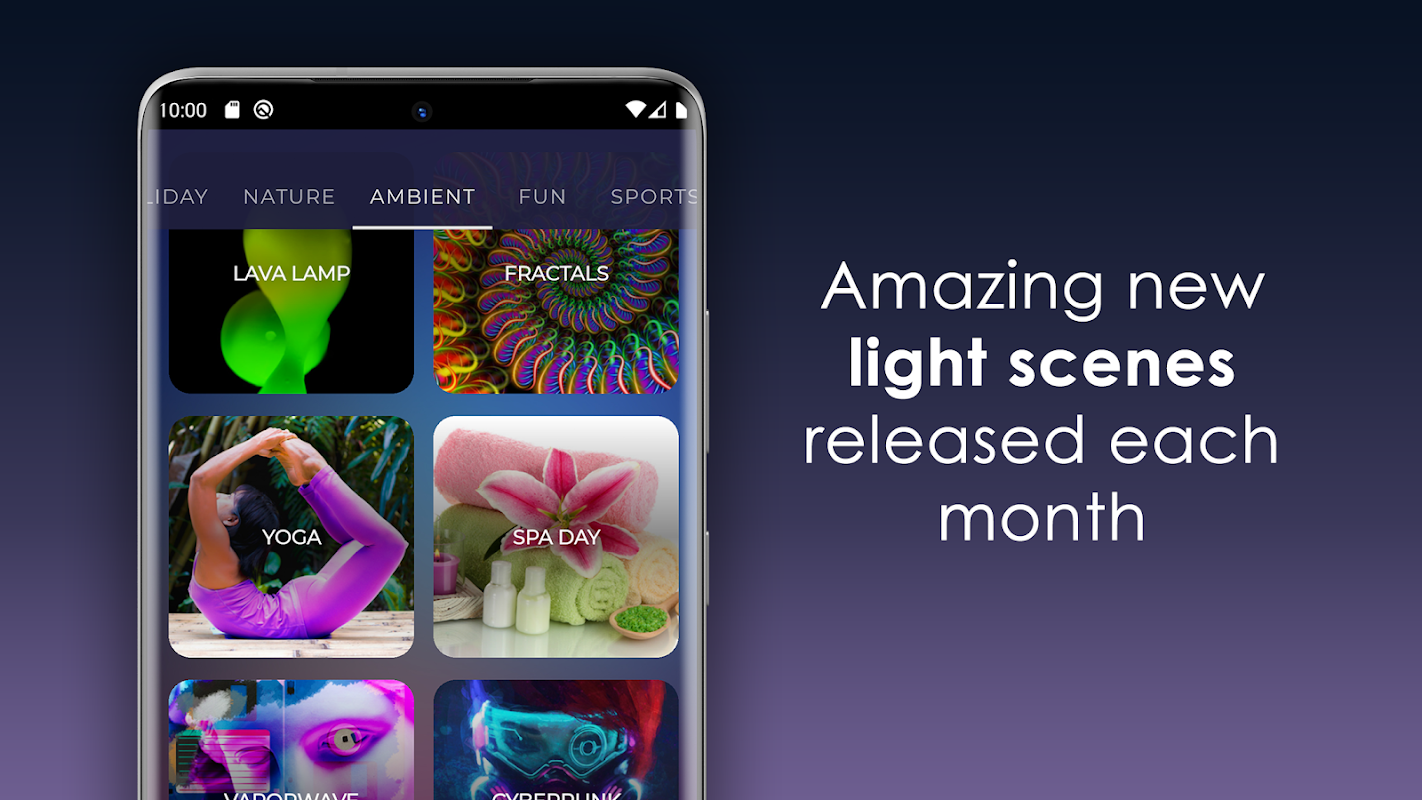 Relaxing ambiance lighting with smooth color flows, nature scenes, health spa style experiences.