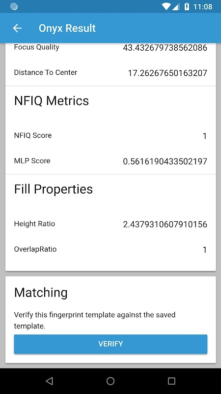 ONYX Camera is an app used to demonstrate the power of the ONYX software library. The user interface of this app displays all the configuration options for the ONYX software development kit. ONYX uses the existing rear facing camera to capture and match a user's fingerprint against an existing fingerprint enrollment.