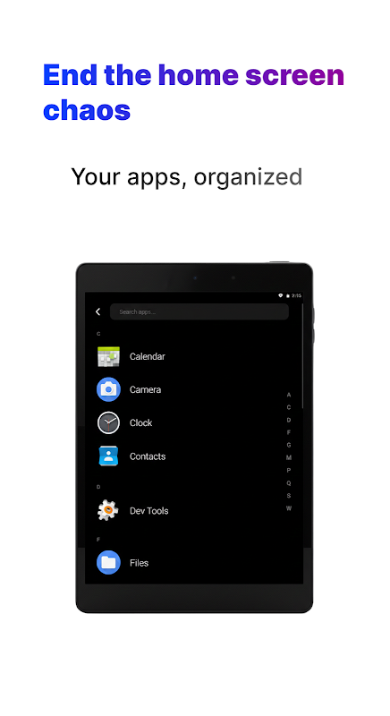 Smart Organization: Find your apps instantly with fluid search and an intuitive alphabetical list.