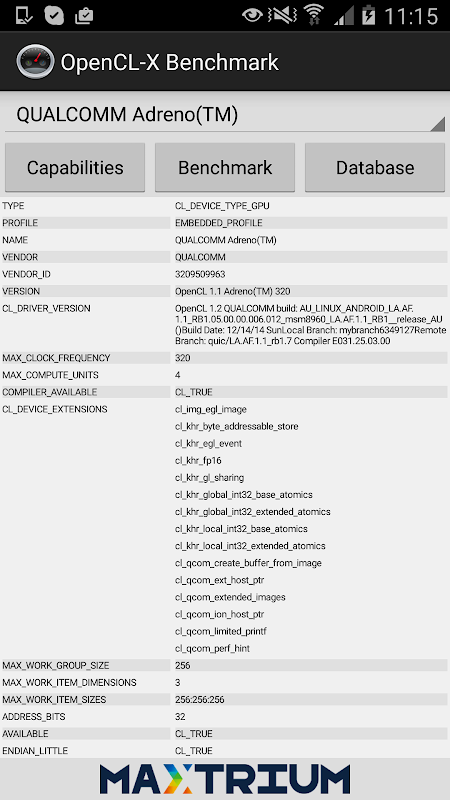 Although the hardware in newer generation devices supports it, Google does not support OpenCL™ to support GPGPU as part of the Android platform at the moment. Therefore, not all devices are equipped with drivers required tot run OpenCL™. OpenCL-X Benchmark provides a large list of Android devices with validated OpenCL™ support and its features. It enables a developer to decide if it make sense for them to utilize OpenCL™ to accelerate their application.