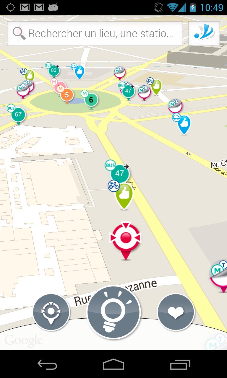 Vous avez la possibilité de découvrir l'offre de transport à proximité de vous en cliquant sur le bouton "ma position". Vous pouvez aussi découvrir l'offre de transport à proximité de n'importe quel point de la région parisienne en effectuant un appui long sur la carte pour créer un pont de référence que vous pouvez nommer. Un touch sur ce point de référence vous permet d'afficher le tracé des lignes qui passent à proximité.