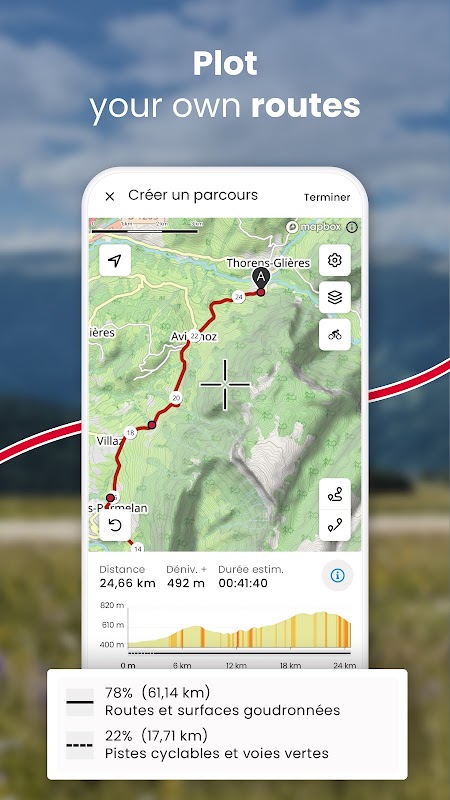 - Plot a route. Directly from your smartphone, you can easily, in just a few clicks, plot a route according to the activity chosen (running, trail running, hiking, cycling, mountain biking, Gravel…) that matches your current desires and abilities thanks to the real-time display of distance and elevation gain, mountain passes to cross, estimated time...