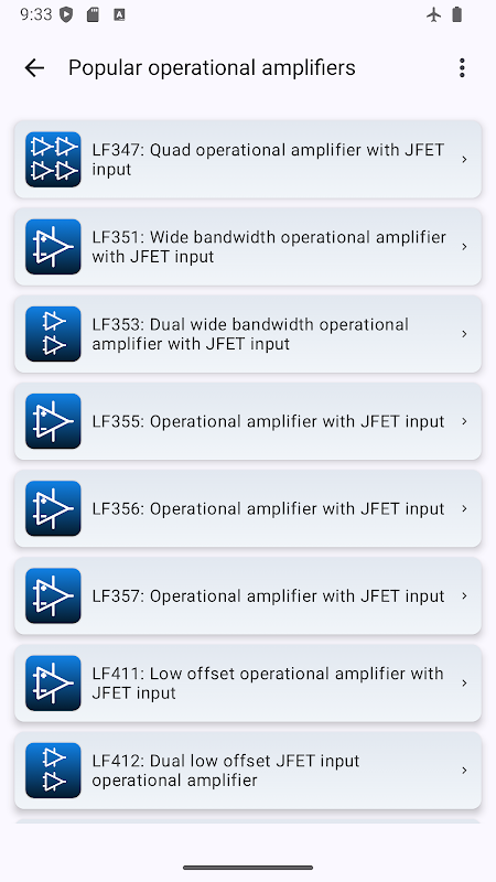 Use it as a practical reference when developing projects, building prototypes, or studying amplifier configurations. The app also includes technical data on popular operational amplifier and comparator series — making it a handy guide for both design and selection.