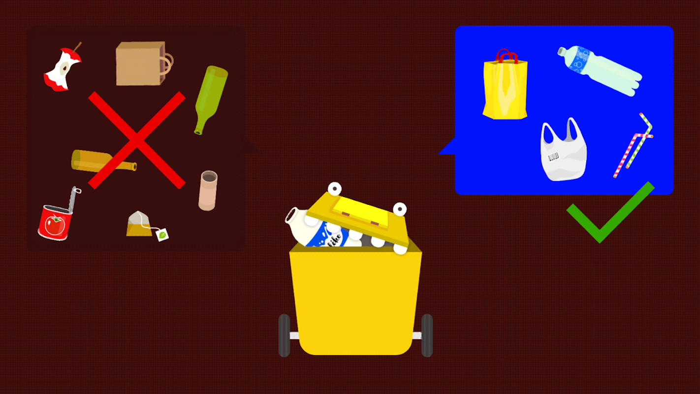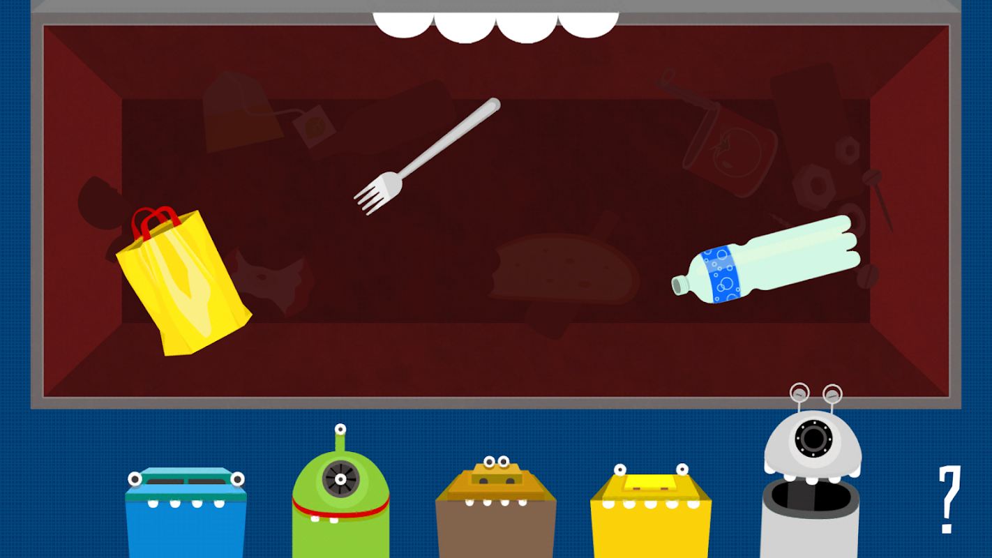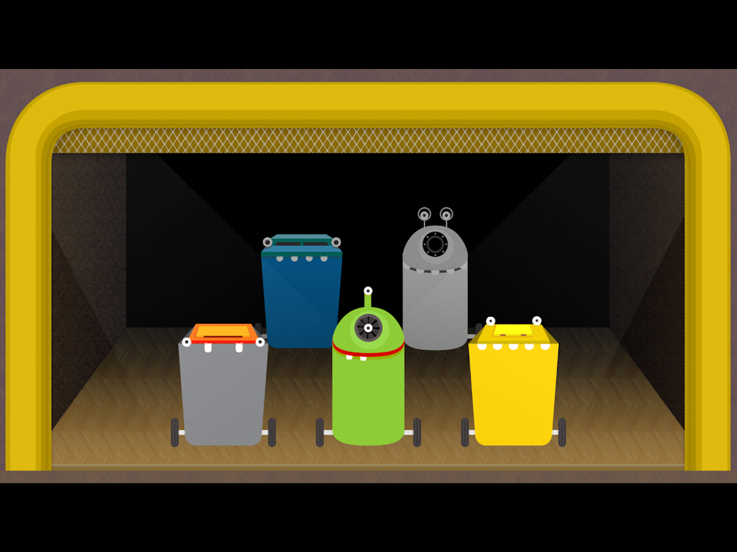 Trash bins are going to perform a show tonight, but people threw out everything into a big container, so now it's completely full. And other bins are empty. Sort the trash into the right trash bins, so they could sing. Who would have guessed the trash bins are so talented?