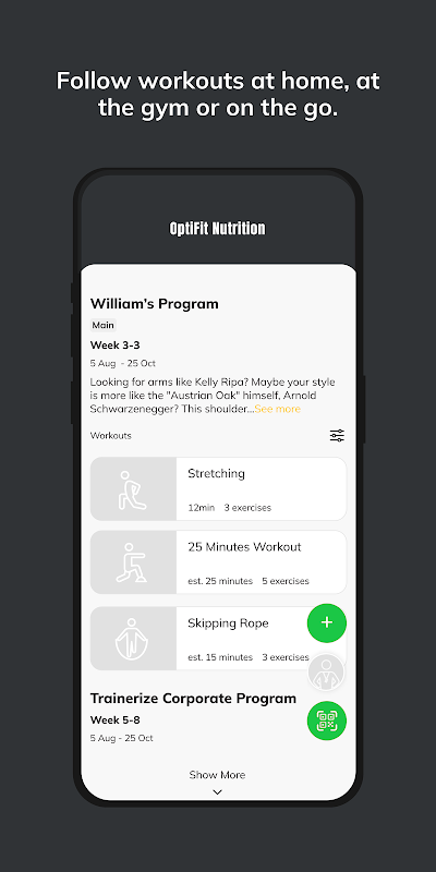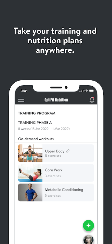With the OptiFit Mobile App, you will have access to our proven nutrition programs and workout programs designed specifically to help you reach your fitness and health goals! You can follow & track your workouts, your nutrition, your lifestyle habits, measurements and results–all with the help of your coach.