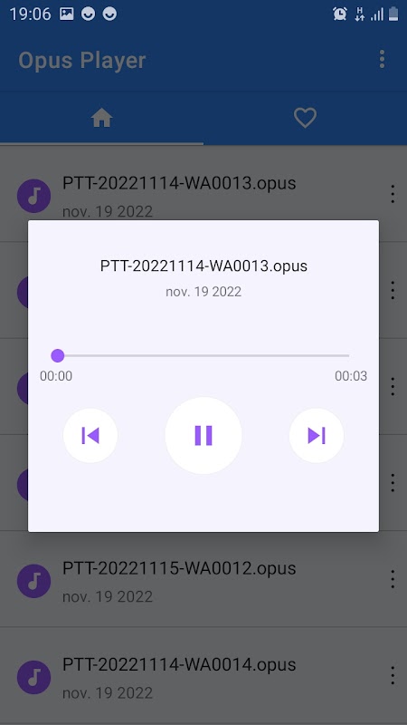 Opus media player it's an opus files reader that list all your opus audios, you can play and listen to any opus audio easily and you can switch between audios using the next and previous buttons, you can also save your favorite audios to favorites so that you can access them easily, and you have also the possibility to share your audios.