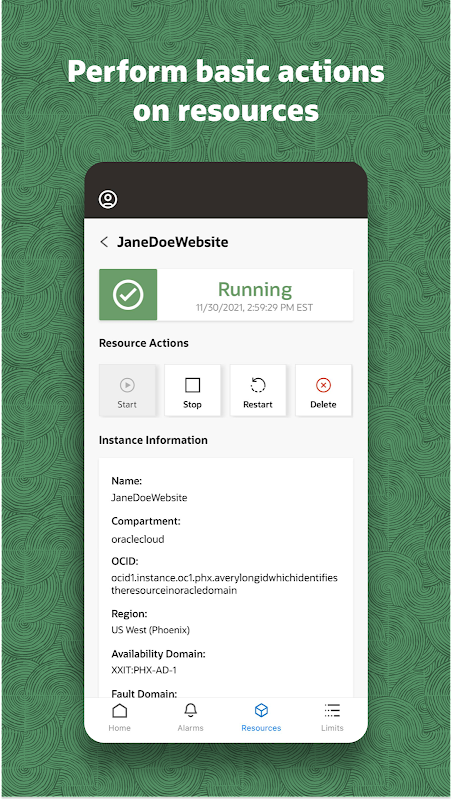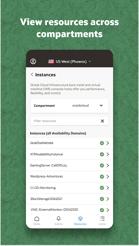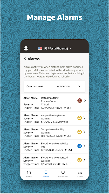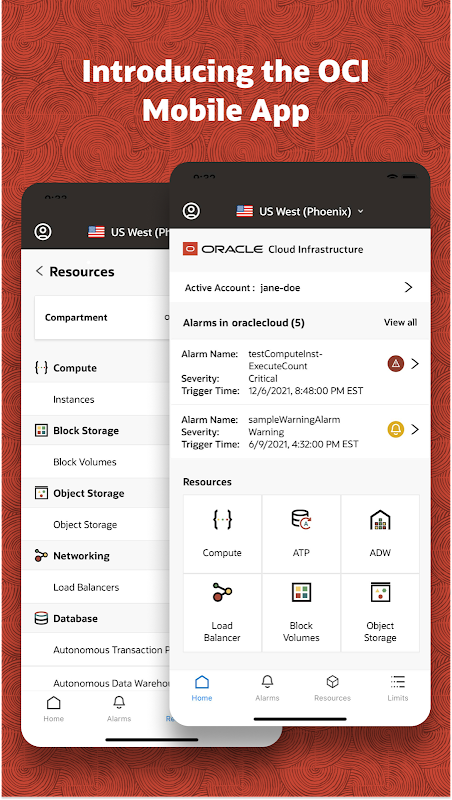 The Oracle Cloud Infrastructure Mobile App lets customers review alerts, notifications, and limits on-the-go. Quickly access information about infrastructure resources, billing, and usage data from your Android devices. Use the mobile app to see: