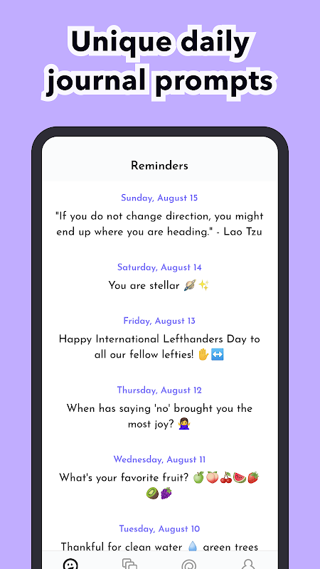 Every morning receive a new daily journaling prompt as a reminder to be grateful and write 3 good things for your self-growth. Quotes about happiness, a fun fact, or little jokes to prompt joy & positivity in your life.
