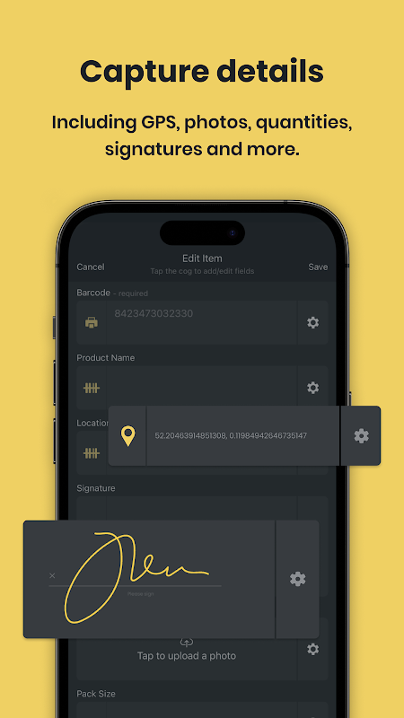 • Capture photos, signatures, GPS locations and more with customizable fields