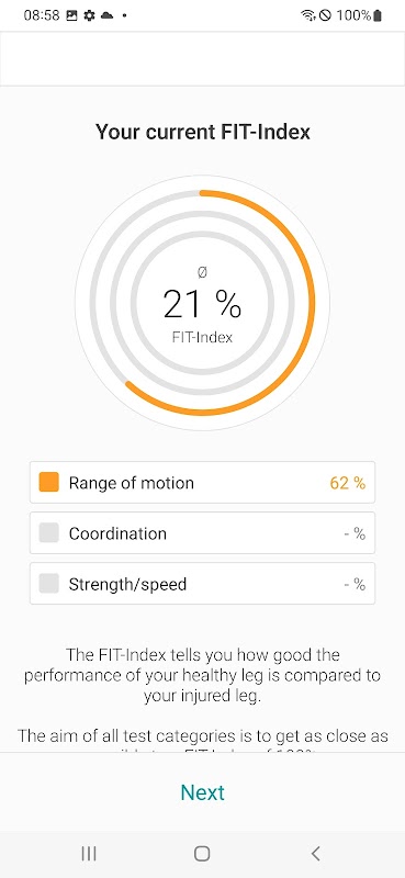Orthelligent Home supports your training after orthopedic and/or trauma surgery diseases. The Orthelligent Home app guides you through the various movement exercises and tests. The associated sensor records movement parameters, the app analyzes them, evaluates them and then gives direct feedback. These analyzes and evaluations provide conclusions about the individual healing process. For evaluation, the measurement results of the injured side are compared with the opposite side - this value is shown in the app as a FIT index and can show the course of therapy more clearly and objectively with further information in the course analysis. Internationally, the Limb Symmetry Index (LSI) is used here. The FIT index or LSI can also be further analyzed in subcategories, which are then displayed in different colors per category. The integrated training program provides support in the home environment.