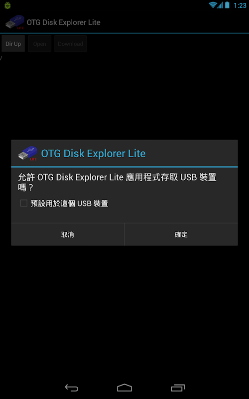 OTG Disk Explorer lets you to read USB flash drives as well as card readers from your Nexus 7 or Nexus 10 tablets. All you have to do is connect the flash drive to an OTG(On-the-go) cable then plug in the micro USB connector of your tablet, then open this app you will see all files in USB drive and you can open them with your favorite app viewers or editors. Current support FAT32 disk format of flash drives. Note: Lite version limit single file size to 30mb, if you need to open file larger than 30mb, please consider OTG Disk Explorer Pro.