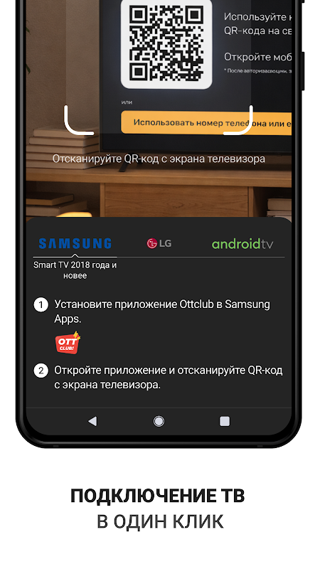 The OTTCLUB app is available on Smart TVs: LG and Samsung, as well as on Android TV. Set up Smart TV in 1 minute on Samsung and LG TVs, you need to install OTTCLUB official online TV application in Samsung App or LG Store to connect.
