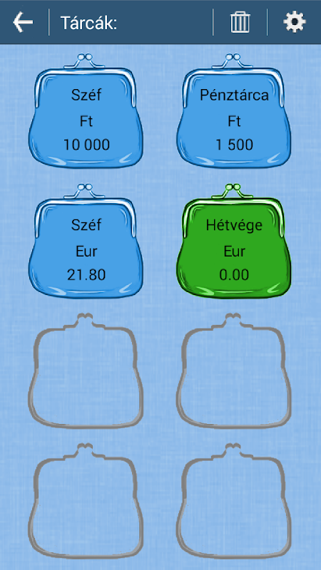 - 8 különböző tárcánk lehet, így párhuzamosan kezelhetjük pl. a zsebünkben vagy bárhol lévő pénzünket, valutáinkat,