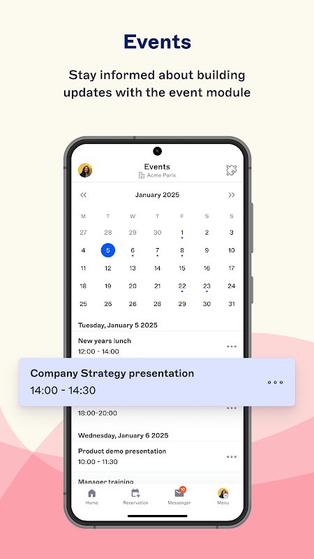 • de bénéficier de services pour simplifier votre quotidien : déclaration et suivi des incidents dans l'immeuble, réservation de salles et de cours à la salle de sport, découverte du menu du jour à la cantine et de l'affluence en temps réel et plein d'autres services !