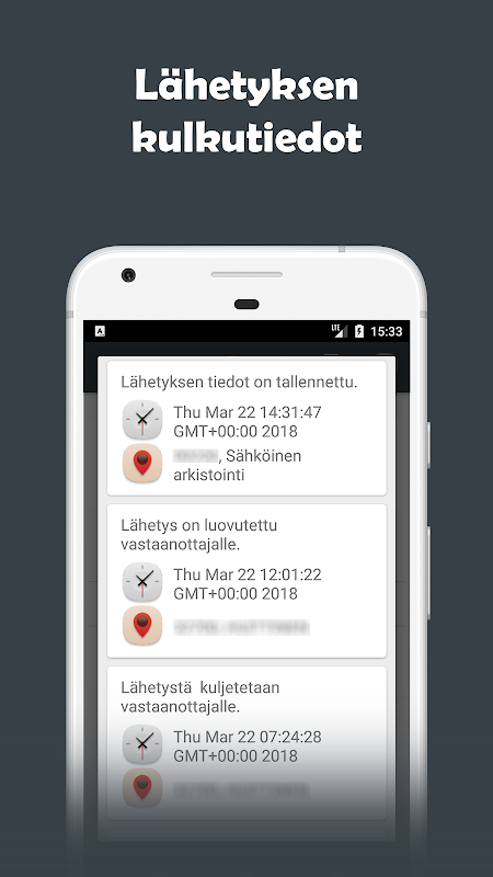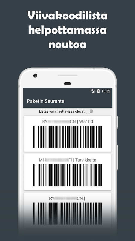 Posti, Matkahuolto, DHL, UPS, FedEx, PostNord, Ärrä Packages and China packages tracking application which has tons of features to help track multiple packages at once. It has barcodes, barcode lists. See features yourself by trying it out.