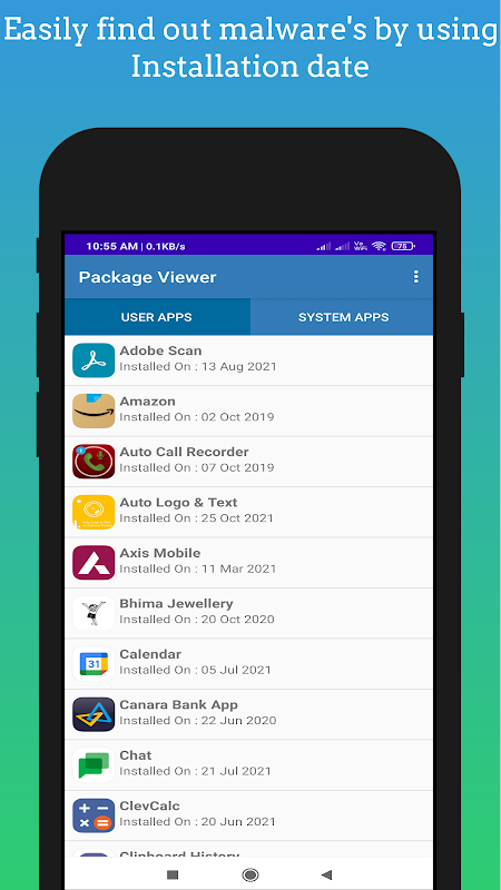 - Each app with installation date (By using this feature, you can easily find out malwares)