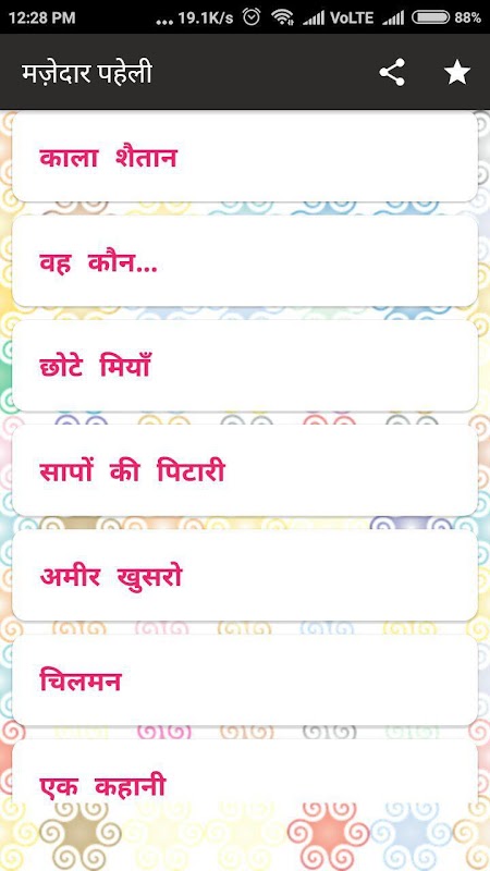 A unique collection of Paheli in Hindi. A clean and clear interface and Hindi text with correct answers to each Paheli. We have also written all Pahelis in Hindi so that our Hindi readers can read them clearly. This is great pleasure reading in your language. You can also share these Paheli in Hindi with WhatsApp, Facebook, Google+ or Twitter. Test your friends and family members on social media how much they know about Paheli. All in all, this application is great, we enjoyed a lot developing it, hope you would like it.