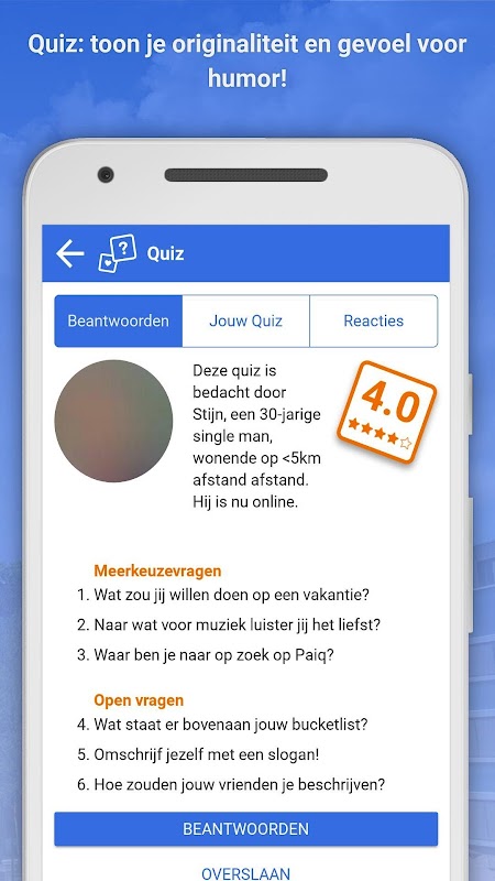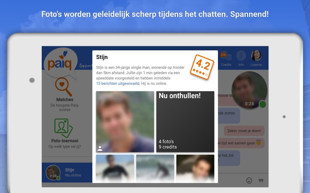 Paiq is a dating app with a unique approach. With Paiq, there's no need to endlessly read through cliché profile texts, but you will get to know each other while chatting right away. You meet people in fun and spontaneous ways, without knowing too much about each other beforehand. Even your photo starts out blurry, and becomes clearer as the conversation goes on.
