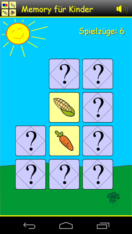 Five different difficulty levels waiting for you. Here you can choose for each step between four different types of cards: Food motives, numbers, letters and colors can be selected.
