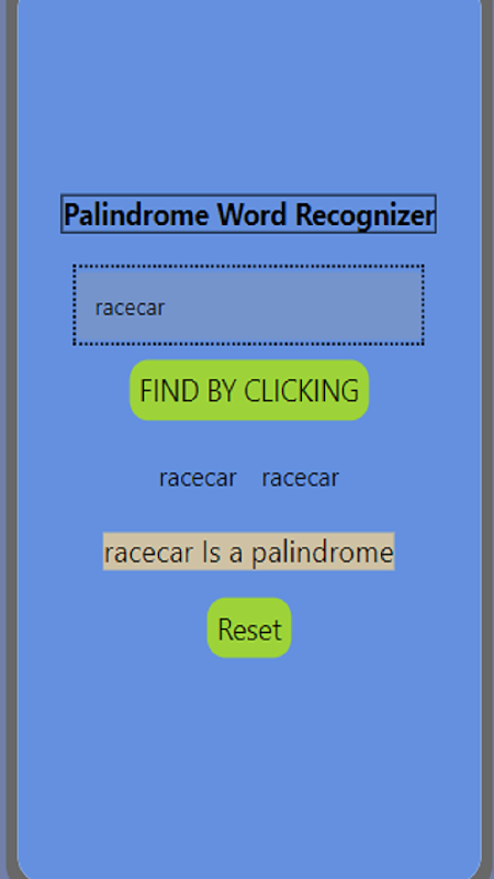 When the app opens there will be a single screen app with a text box. If you write in the text box 1. make sure the word is lowercase and 2. Click, "FIND BY CLICKING," When you see whether the word is a Palindrome word or not, click, "reset," And everything will become empty leaving you with a blank space to go again. When you are done, exit the app.
