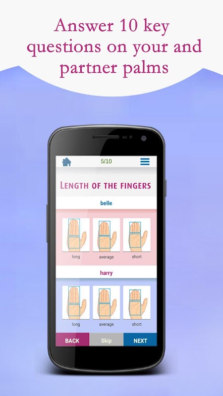 In a playful mode answer 10 questions on your and your partner's palm characteristics as requested by the PalmMATCH app, and receive a detailed report of your potential relationship as well as the match score.