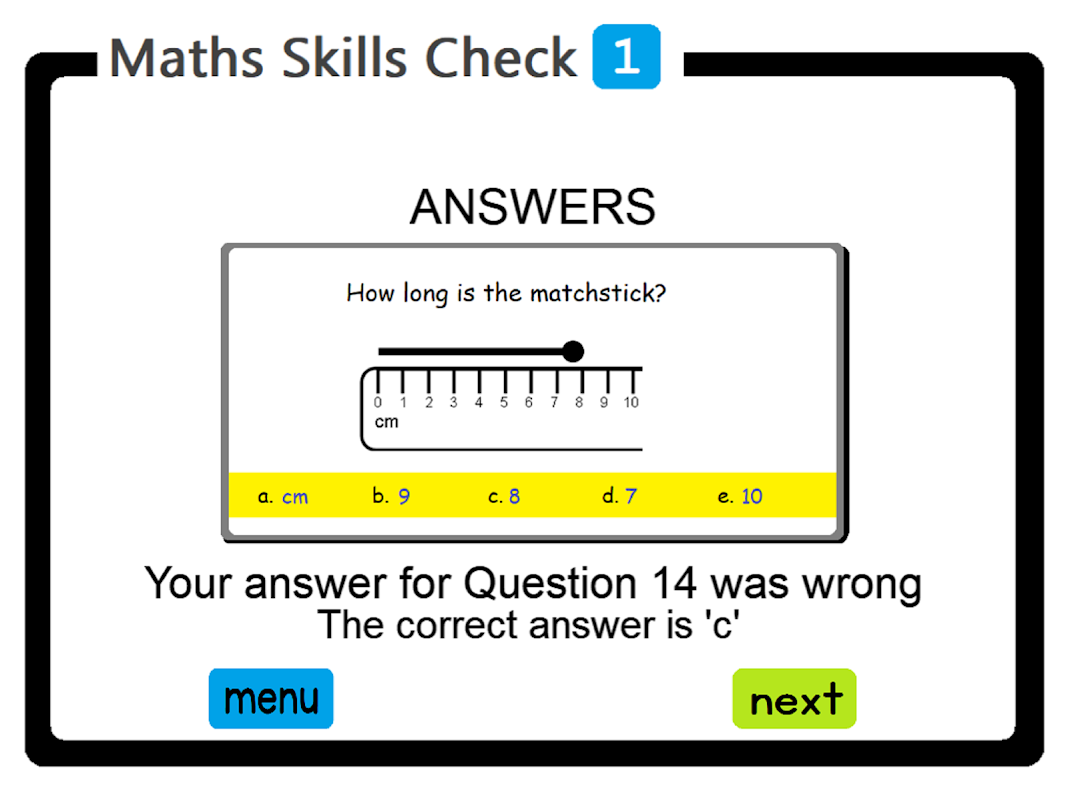 Having completed the skills check, the app allows the pupils to go through each question to see which ones they got right and which ones they got wrong. Here the teacher can teach to any of the common class/group misconceptions. The pupil prompts are live in the answer section so that you can use them as a teaching aid. So with this app, you get all the benefits of the paper system that you currently use but with all the advantage of it being done on an app. You should see a big saving on photocopying costs and in saving of teacher time.
