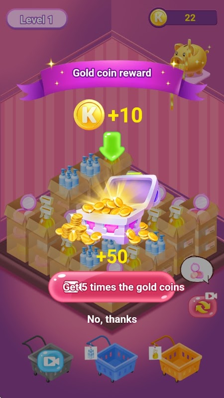 A puzzle game. Use clicks to perform operations. When three identical cardboard boxes are found and placed in the corresponding handcart, they are eliminated and scored. Game objective: Reasonable operation and smooth clearance.