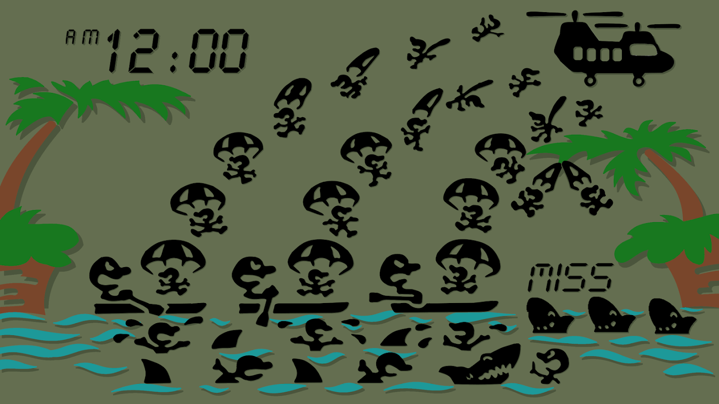 The game has two modes of play, called GAME A and GAME B, the difference in GAME B is that some parachuters get stuck on the palm tree before falling into your boat. Parachuters fall down in 3 lanes one at a time at the beginning and the more you catch the more they start increasing. You score 1 point for each parachuter caught. The game ends with 3 misses. There are also 2 bonus scores you need to reach in order to clear all your misses, and they are 200 and 500. If you get to these scores, any misses you have will be erased. The maximum score you can reach is 999 and then the game will continue from 0 increasing the descending speed of the parachuters each time this score is reached.