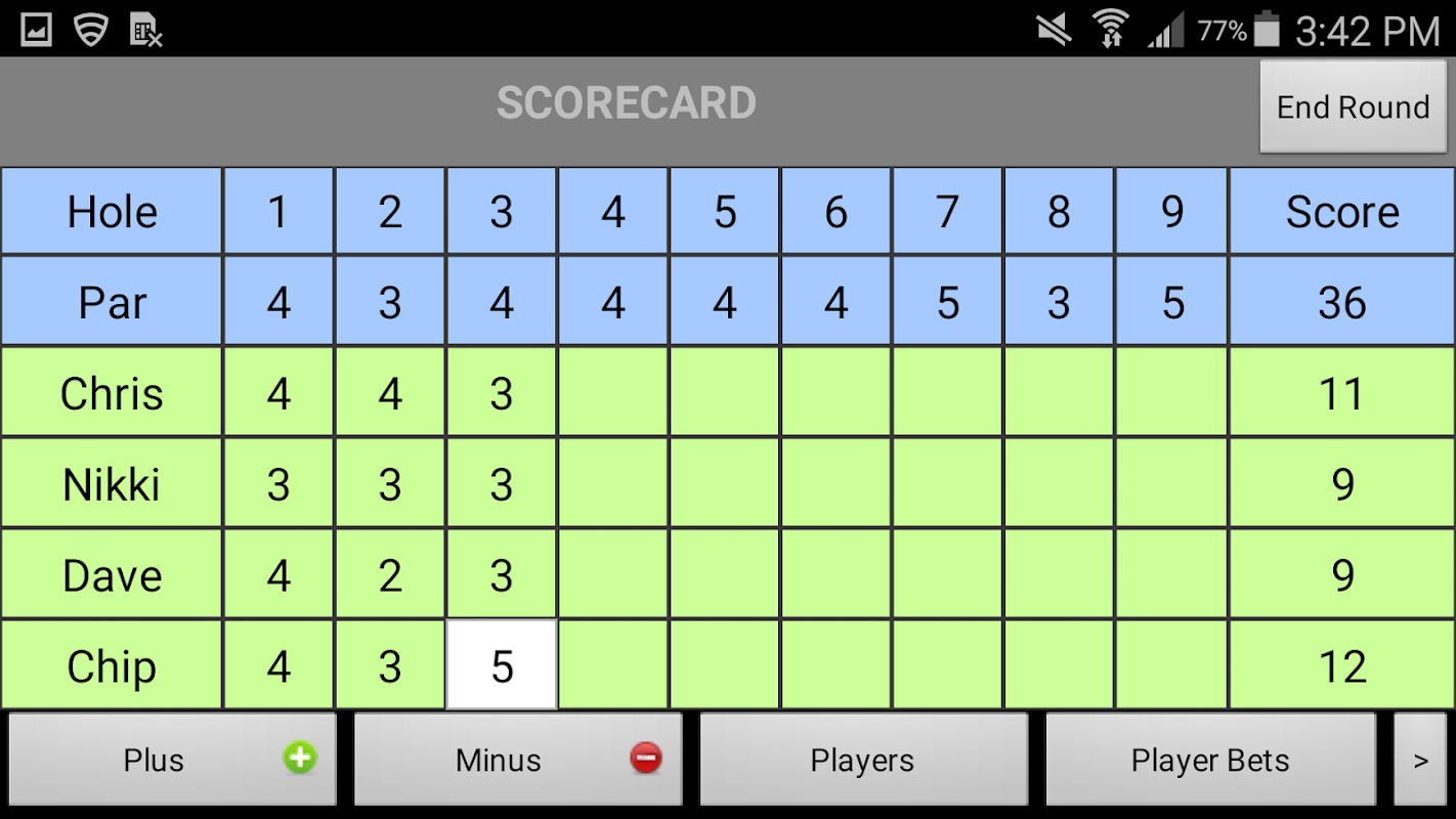 - Auto-populates par for each hole and allows you to simply add or subtract from par