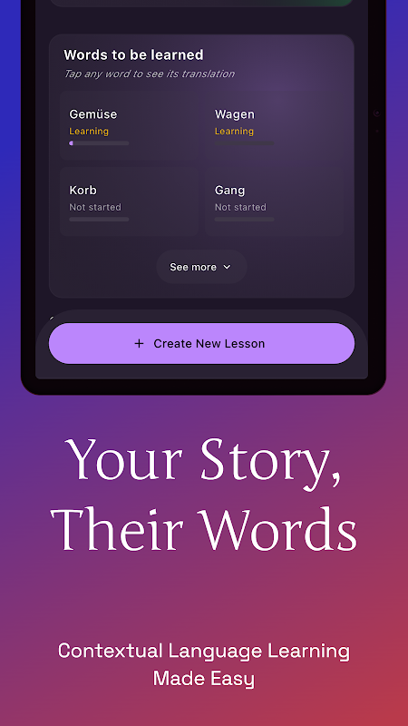 · Choose or Customize Lessons: select from curated word categories — like travel, food, or daily life — or create your own custom lessons with vocabulary you actually want to use.