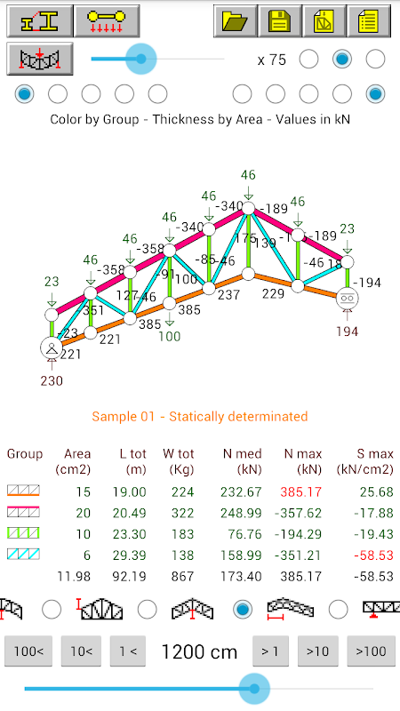 When the user changes the value of any parameter the truss is updated and the system automatically recalculates and dynamically presents the results. This enables the optimization of structural design, determining the values that produce minimum forces, stresses, deflections and self-weight of the structure.