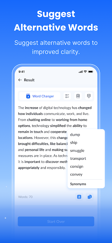 If you don’t like the changes that are initially made by our paraphrase app, you can make your own modifications to the output text. You can tap the bold words and choose different synonyms to apply in their place.