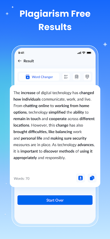 This Tool is based on advanced AI modes, which help it make smart and intelligent changes to the provided text. You can enhance the quality of your text and make it unique. Rewriting app does not require any registration. Just download and enjoy.