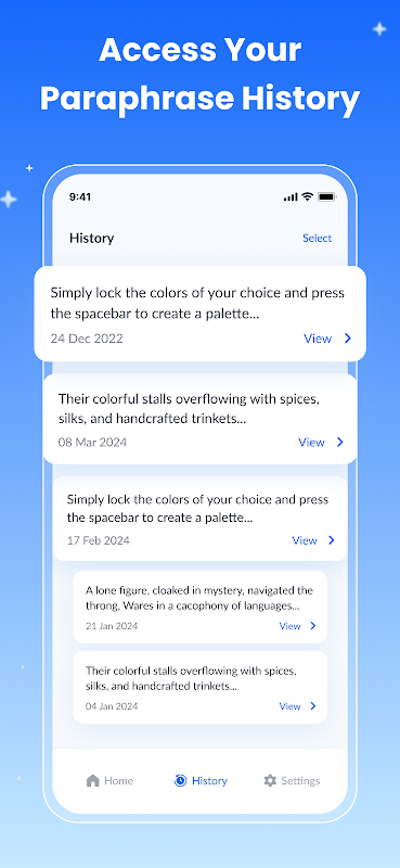 When you Paraphraser Text with our app, the past results are saved in the “History” tab. You can see the texts that you have rephrased earlier. If you need to retrieve an old result, you can download it back using the “History” option.