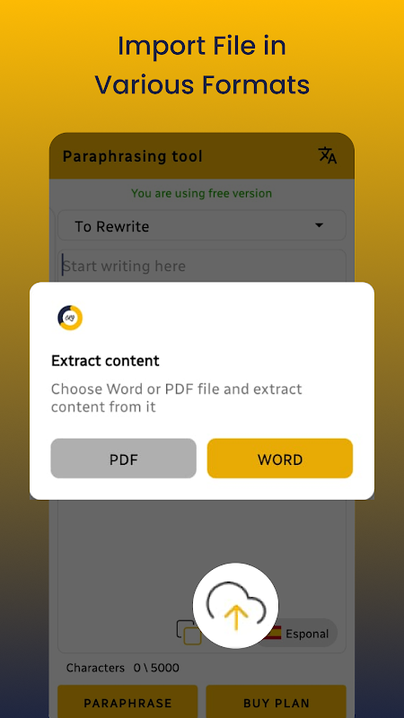 1) Extract Text from Word or PDF files: parafrasear aims to make paraphrasing as easy as possible. If your text is in a Word or PDF document, there's no need to manually copy it. Just upload the file, and this paraphrase tool will extract the text for you. This convenient feature saves time and automatically rewrite full text.