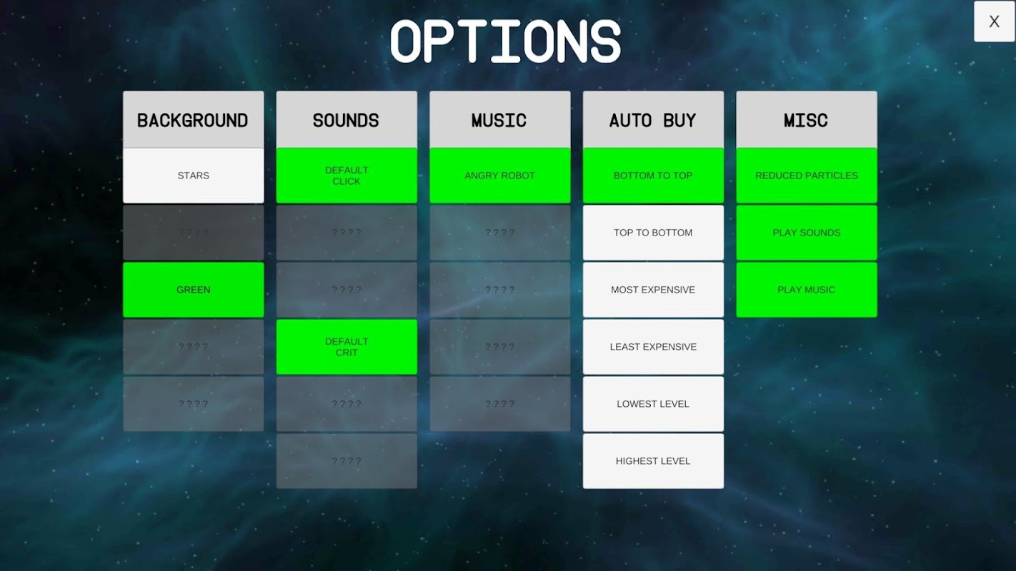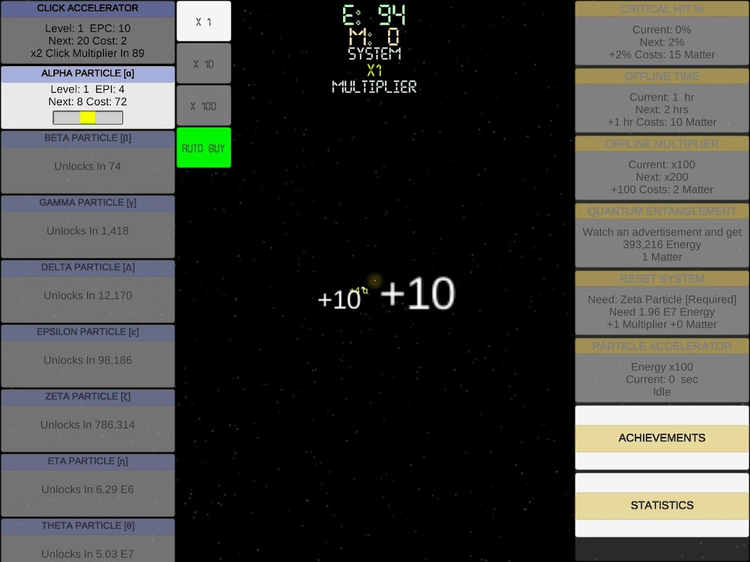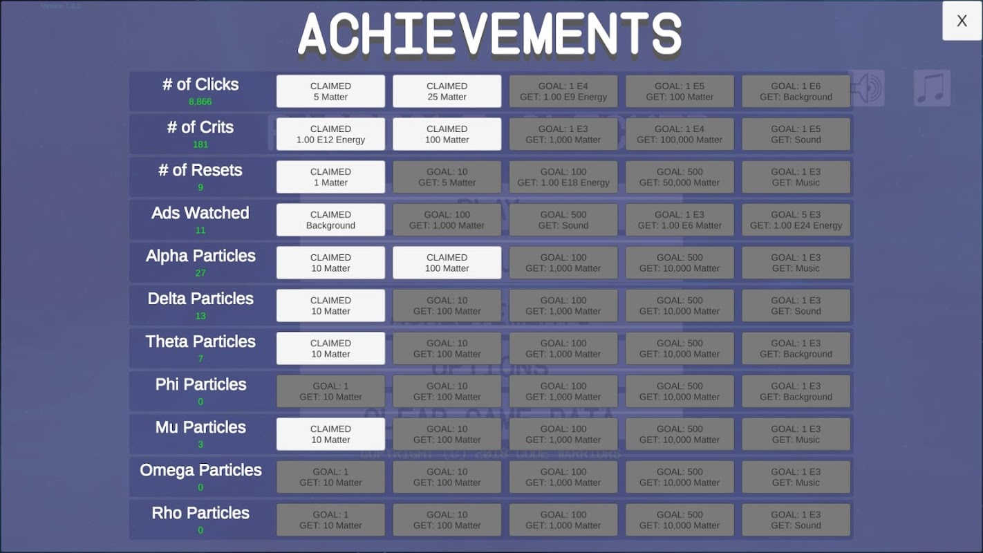 In this idle game, you can generate energy by unlocking particles, earn rewards by achieving set goals, reset the system to gain universe multipliers, and click the screen to gain multiplier for clicking, and critical hits.