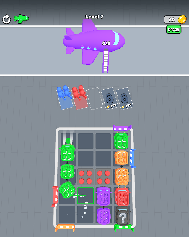 Match the Colors: Ensure passengers board planes of the same color by strategically moving the buses.