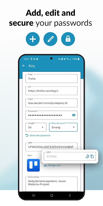 With PassSecurium™ you can access your password vault, and manage passwords securely and conveniently. Besides standard functions (create / view / edit / delete passwords) PassSecurium™ offers an integrated password generator with selectable complexity.