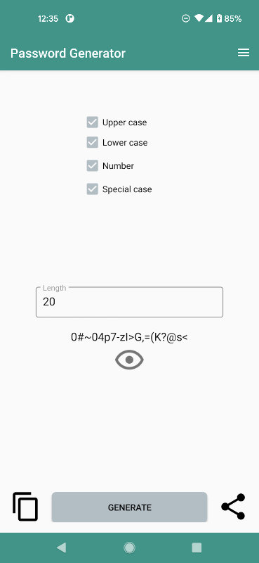 The application is used to generate the password of the length you choose. The password can contain both small and large characters, digits and special characters.