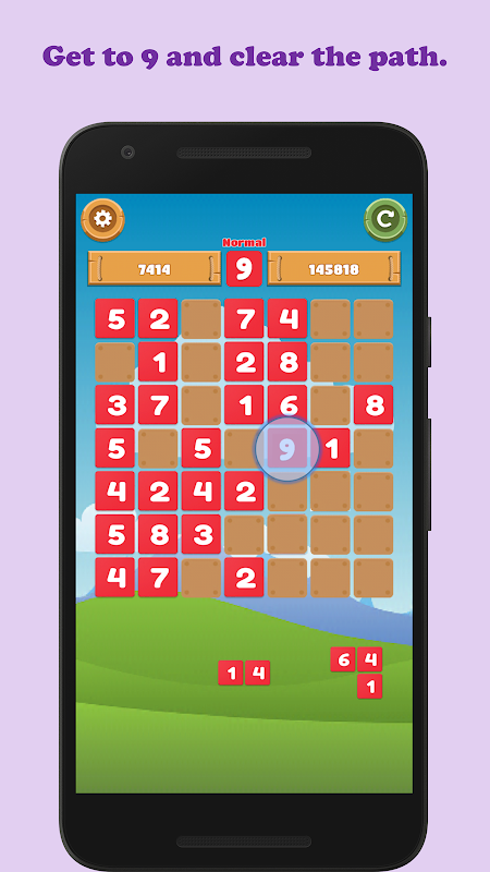 In this number puzzle game, the objective is to establish a path to 9 using the number groups given at the bottom of the screen.