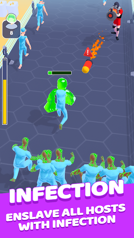 Transform the host into a mutant and infect the people next to you. Reach the end of the track before dying and infect everyone that is left. Move to the next place.