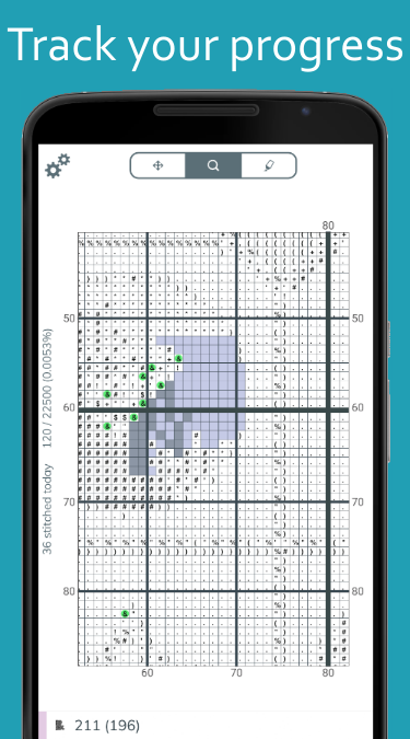 Keep motivated by tracking your progress. Get a tally of how many stitches you finished, today and in total, and see how many stitches are left for each thread.