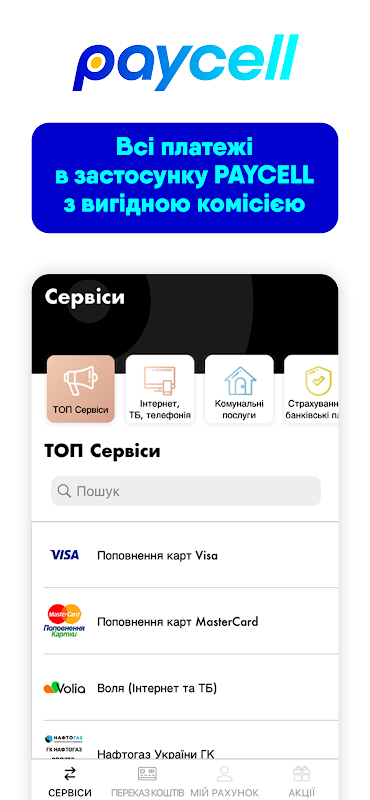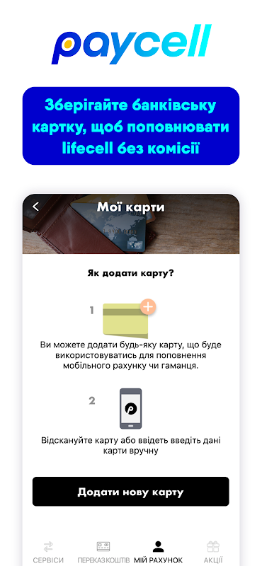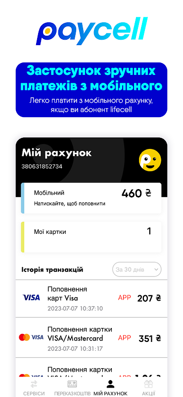 Paycell mobile application allows lifecell subscribers to use mobile funds to pay for popular products or services. This is a convenient and secure way to pay for more than 1000 services with a favorable commission.