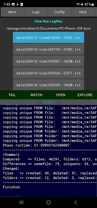 To run the app, you'll simply select FROM and TO content folders on your devices, run a SYNC or other action by tapping its button in the Main tab, and check the action's progress and results in the Logs tab.