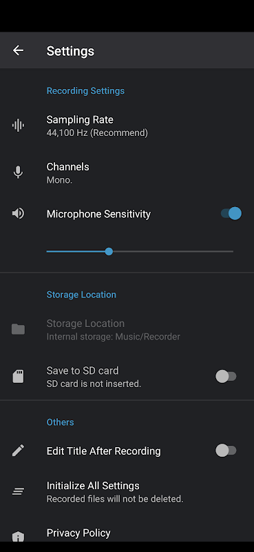 The sampling rate can be changed to 8k, 16k, 44.1k, 48kHz.