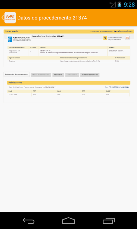 PcPG es una aplicación desarrollada por la Agencia para la Modernización Tecnológica de Galicia (Amtega) que permite la consulta, mediante dispositivos móviles, de la información de la Plataforma de Contratos Públicos de Galicia. Disponible tanto en gallego como en castellano, se actualiza de manera constante con la reutilización de la información procedente de http://www.contratosdegalicia.es, con lo que permite acceder a las últimas publicaciones de la plataforma, a aquellas que se encuentran en plazo de presentación de ofertas, a las pendientes de adjudicar, a las que se encuentran en los últimos días de plazo de presentación y a las próximas mesas de contratación. Incluye también la opción de consulta de los diferentes perfiles de contratante y la posibilidad de señalar determinados procedimientos como favoritos para facilitar su seguimiento.