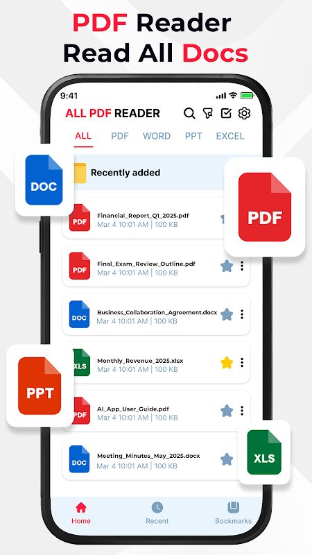 Looking for a smart and powerful document editor for Android? This PDF Viewer - All PDF Reader app is your complete solution to open, view, and edit all major document types including PDF files, Word documents (DOC, DOCX), Excel spreadsheets (XLS, XLSX), and PowerPoint presentations (PPT, PPTX) - all in one convenient and efficient interface.