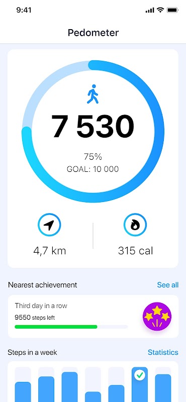 Various achievements in step counter are a good self-motivation to reach another goal. Also our pedometer - step counter will support you and congratulate for achievements.